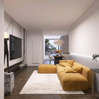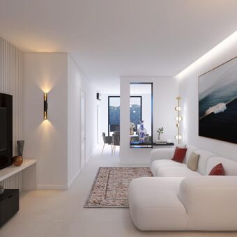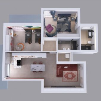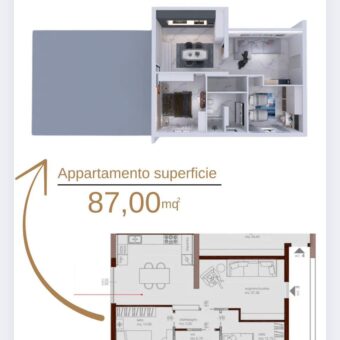 L’appartamento si apre su un disimpegno che conduce alla luminosa zona giorno con cucina e salone in un unico ambiente, dalla quale si accede a un ampio balcone perimetrale che circonda la casa. La zona notte è composta da una spaziosa camera da letto matrimoniale di circa 5×5 metri e da un bagno grande, completo di doccia.