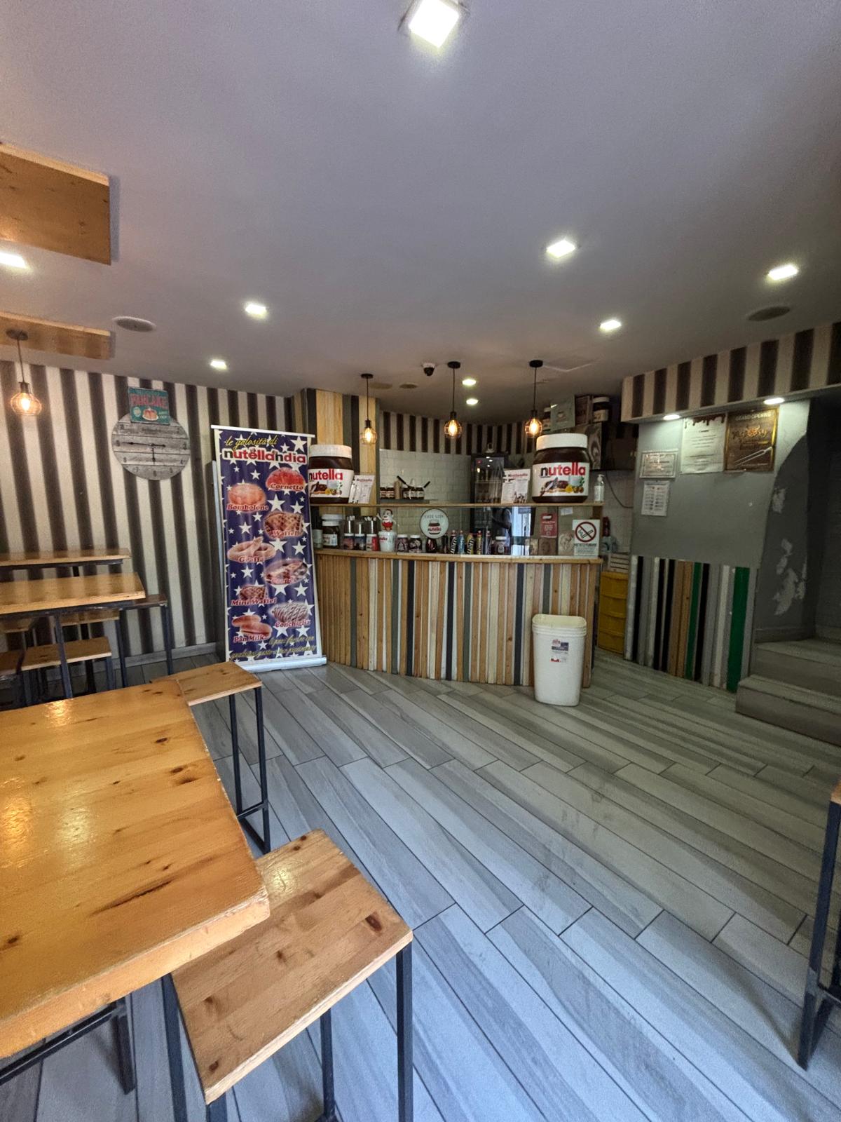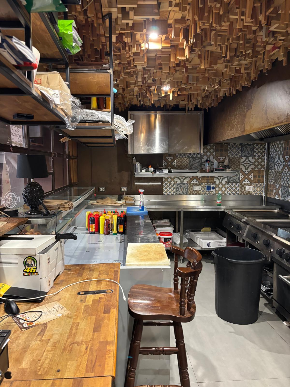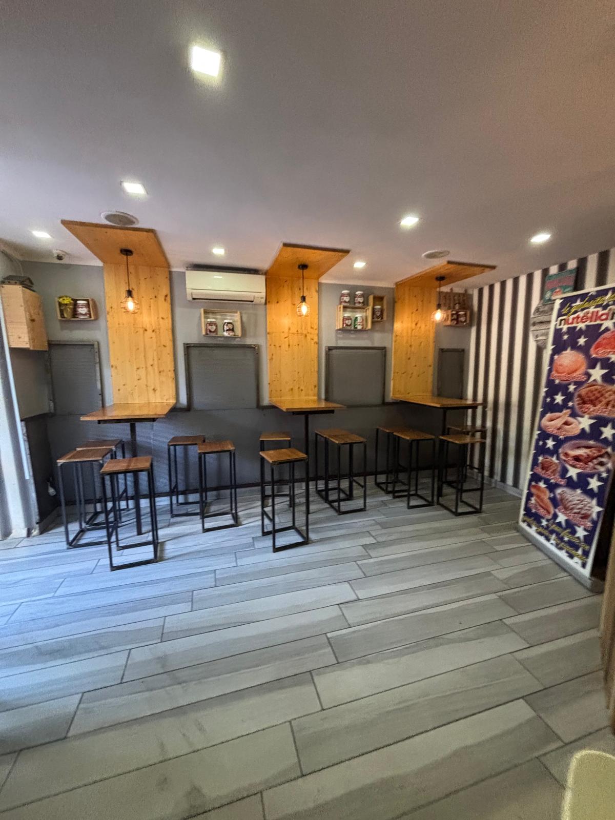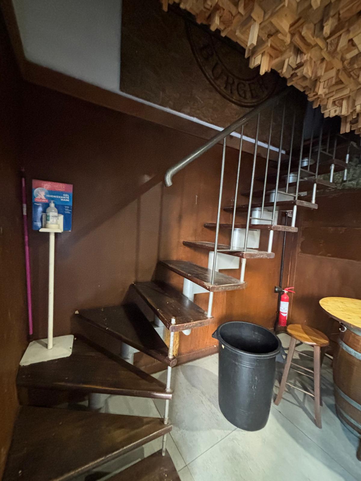 Il locale ha una superficie di circa 40 mq distribuiti su due livelli: al piano terra si trovano la sala con bancone, la cucina e circa 20 posti a sedere interni, mentre al piano superiore è presente un comodo deposito.