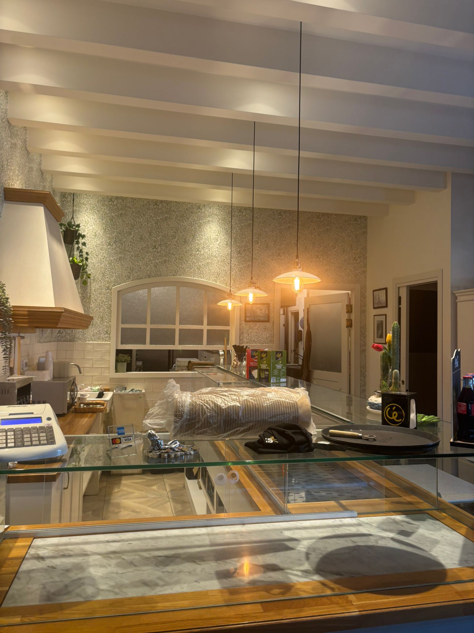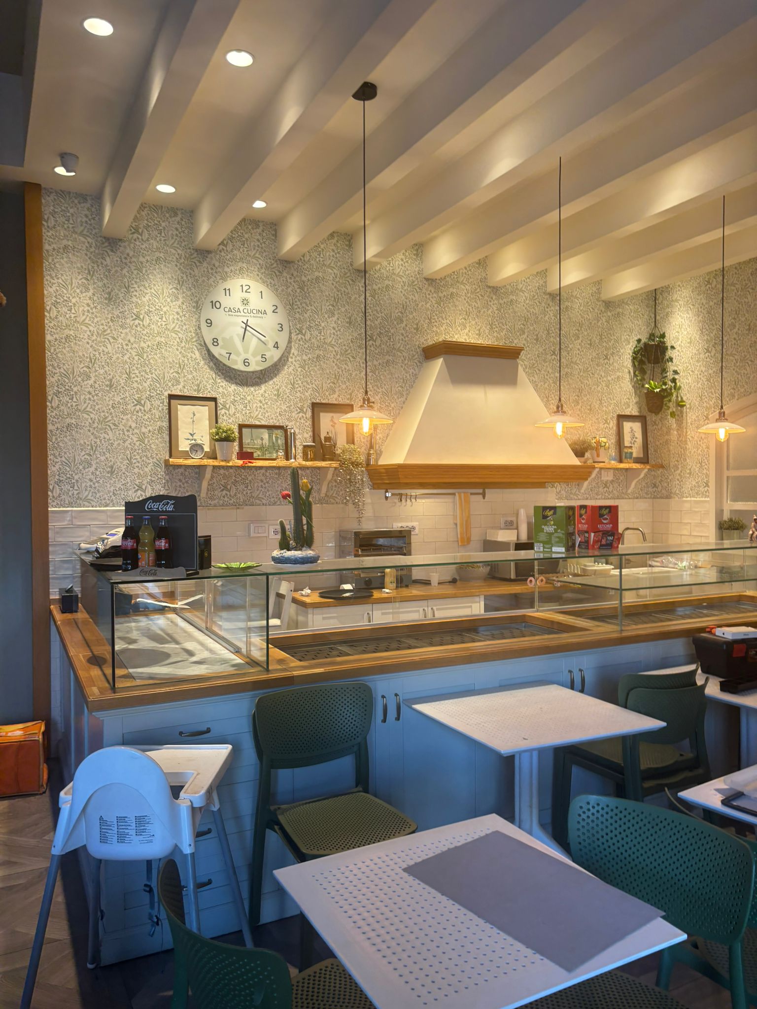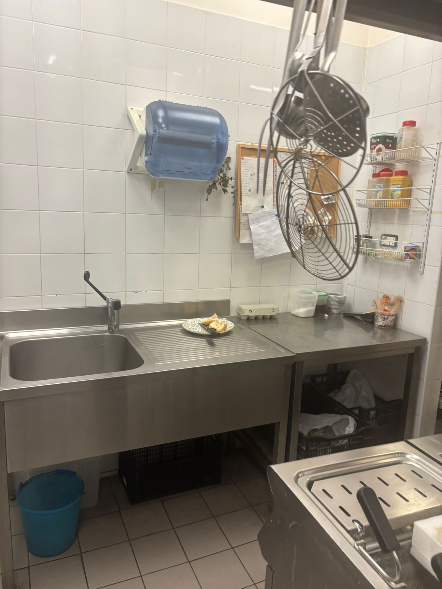 All’interno troviamo un’accogliente sala con bancone e vetrine calde, zona cassa, spazio per la consumazione, bagno per il pubblico e, sul retro, un’ampia cucina professionale dotata di ogni attrezzatura necessaria per la ristorazione, con annesso piccolo deposito e bagno per il personale.