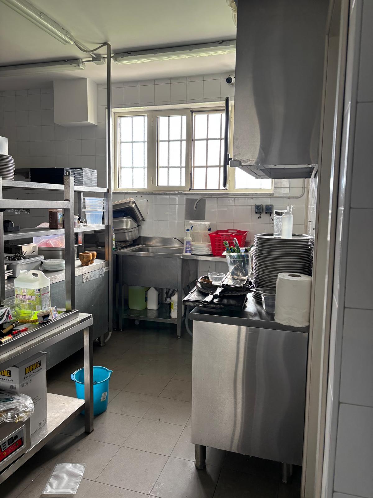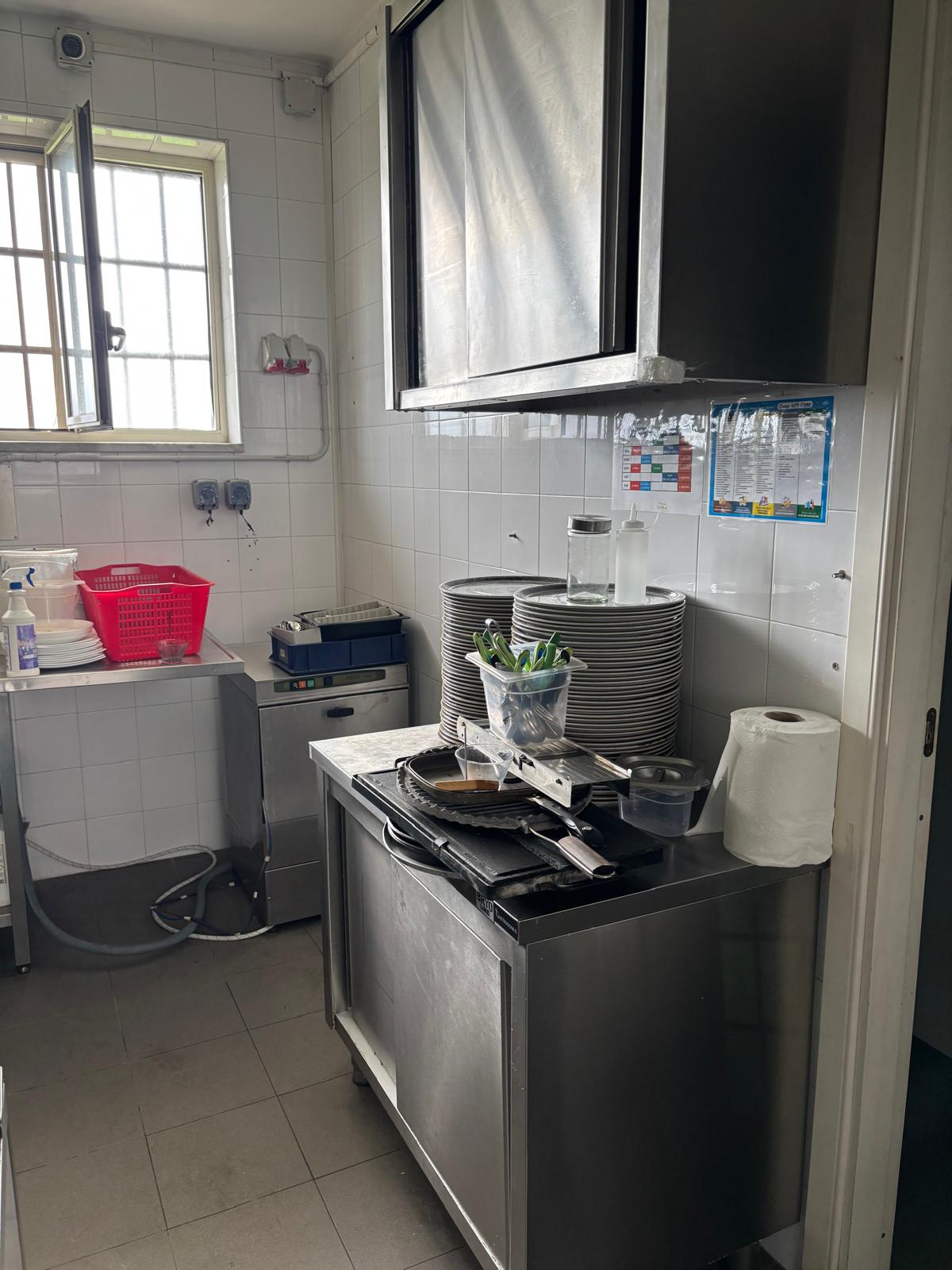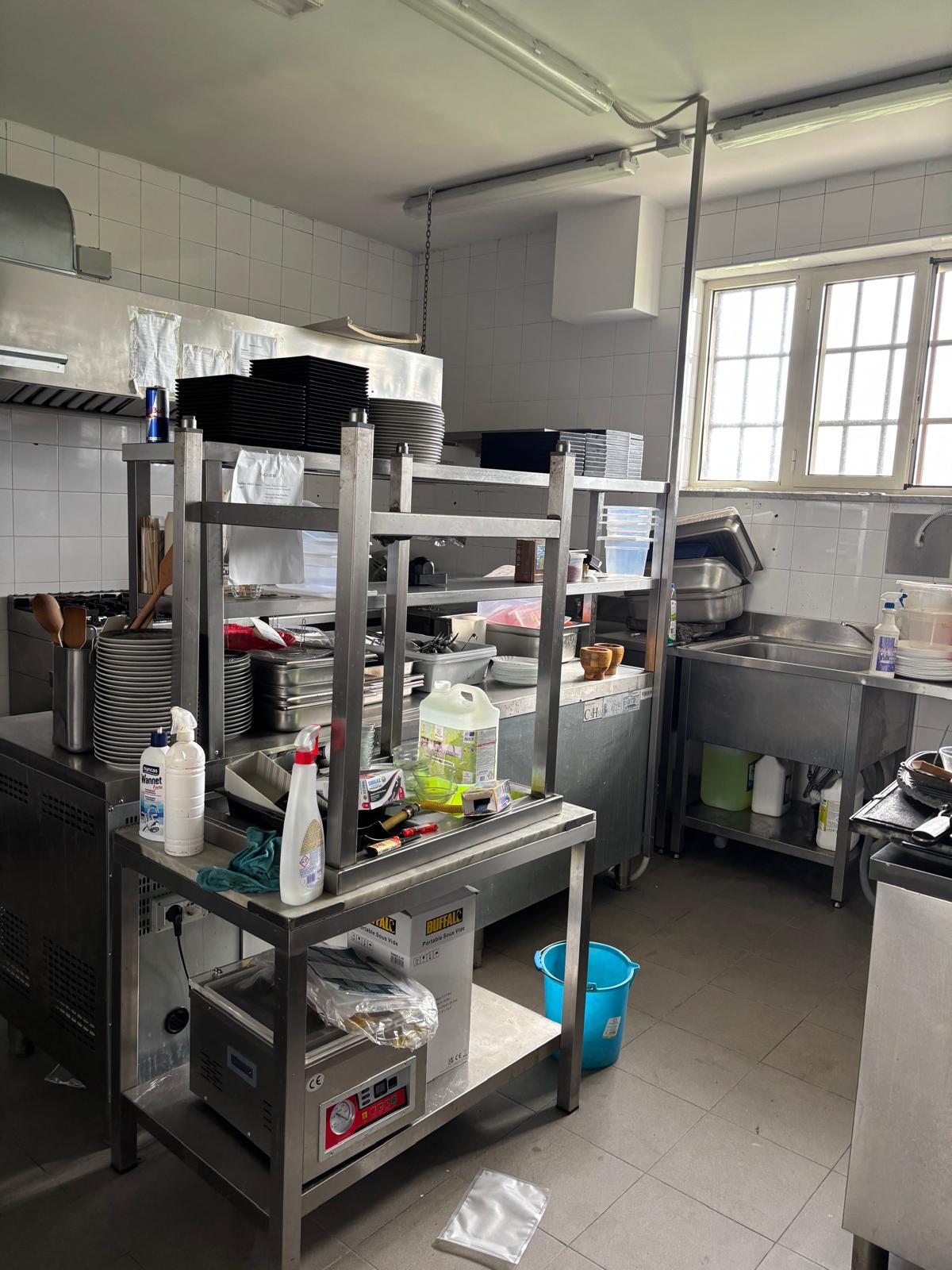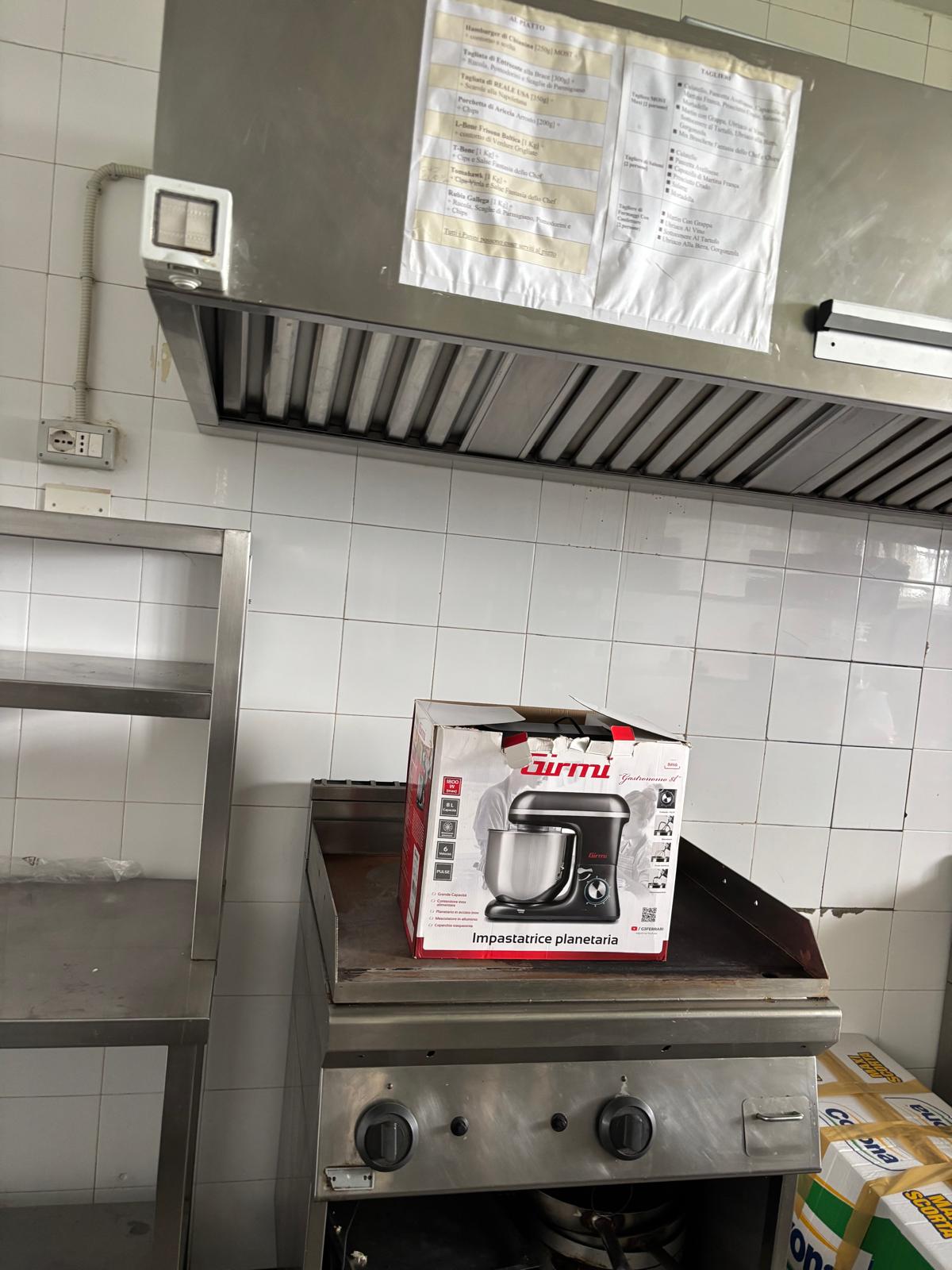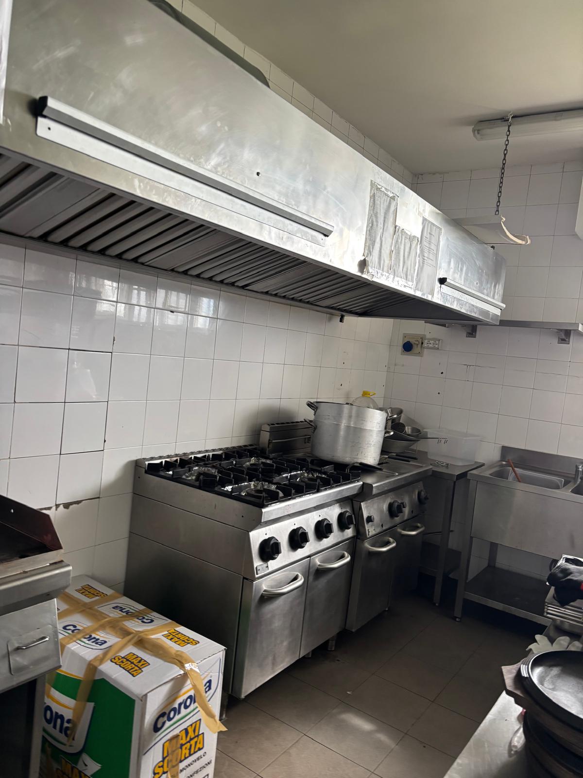 cappa aspiratrice, cucina a 4 fuochi, doppia friggitrice, abbattitore, triplo lavabo, refrigeratore, forno elettrico, lavastoviglie e banco lavoro in acciaio inox.