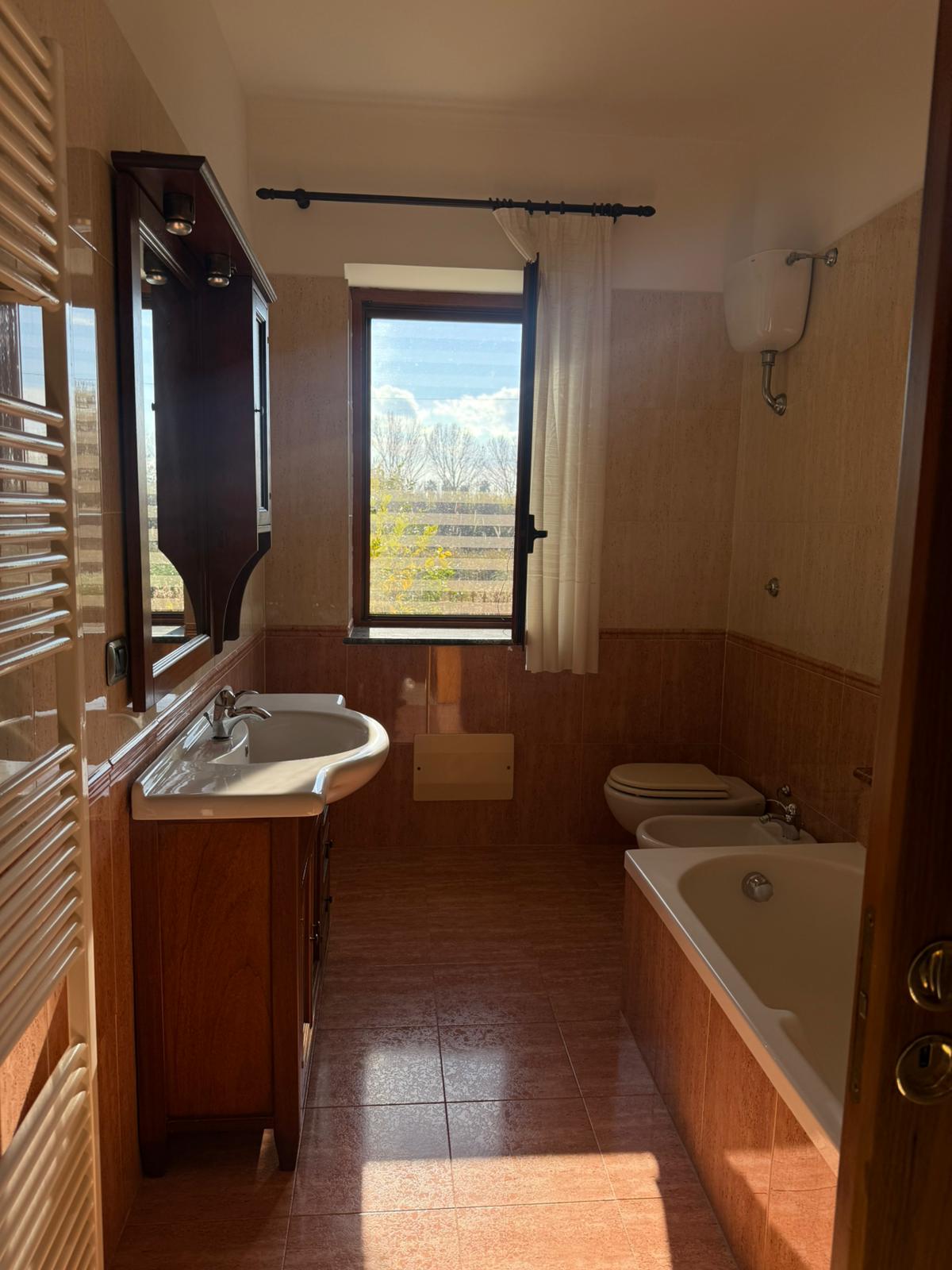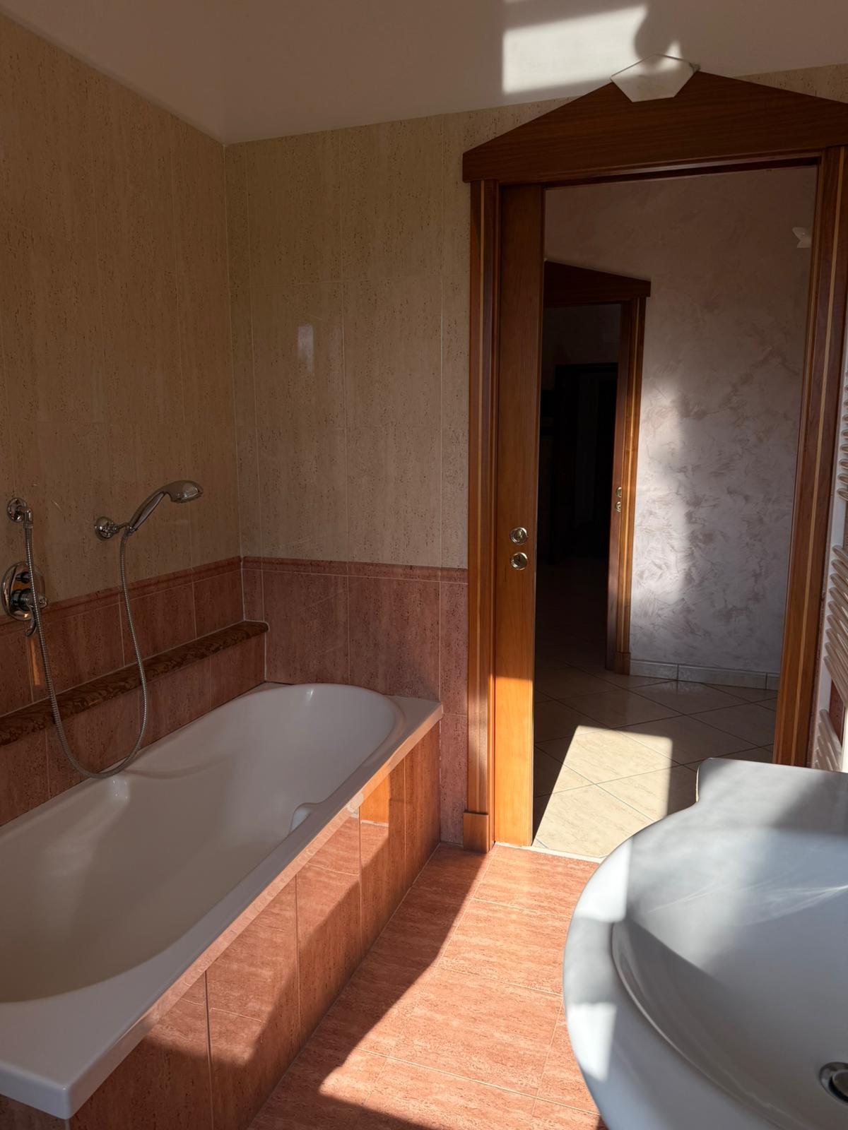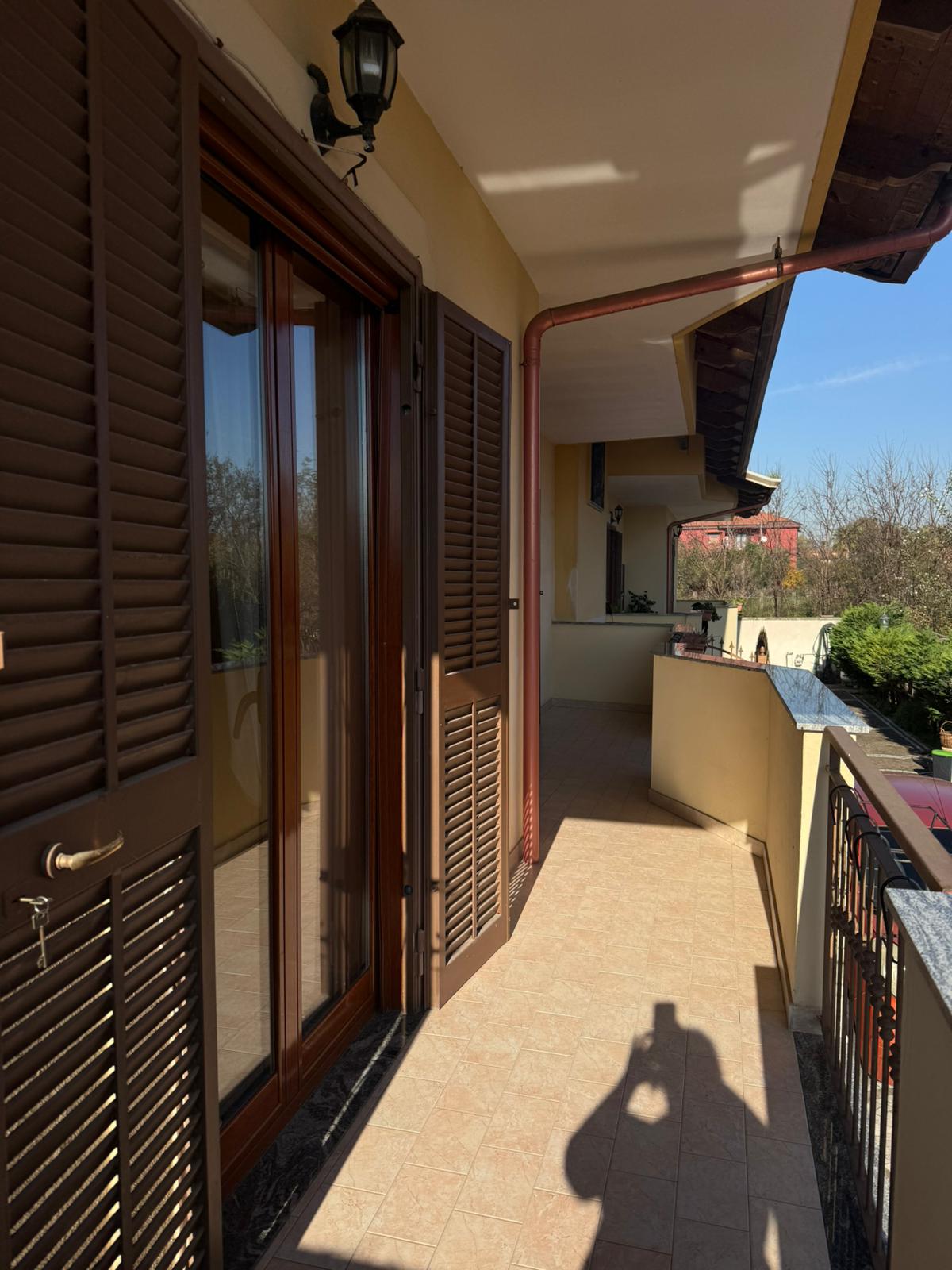 L’ingresso, condiviso con l’altra porzione di villa, conduce a un’abitazione luminosa e ben distribuita, con circa 130 mq interni.
