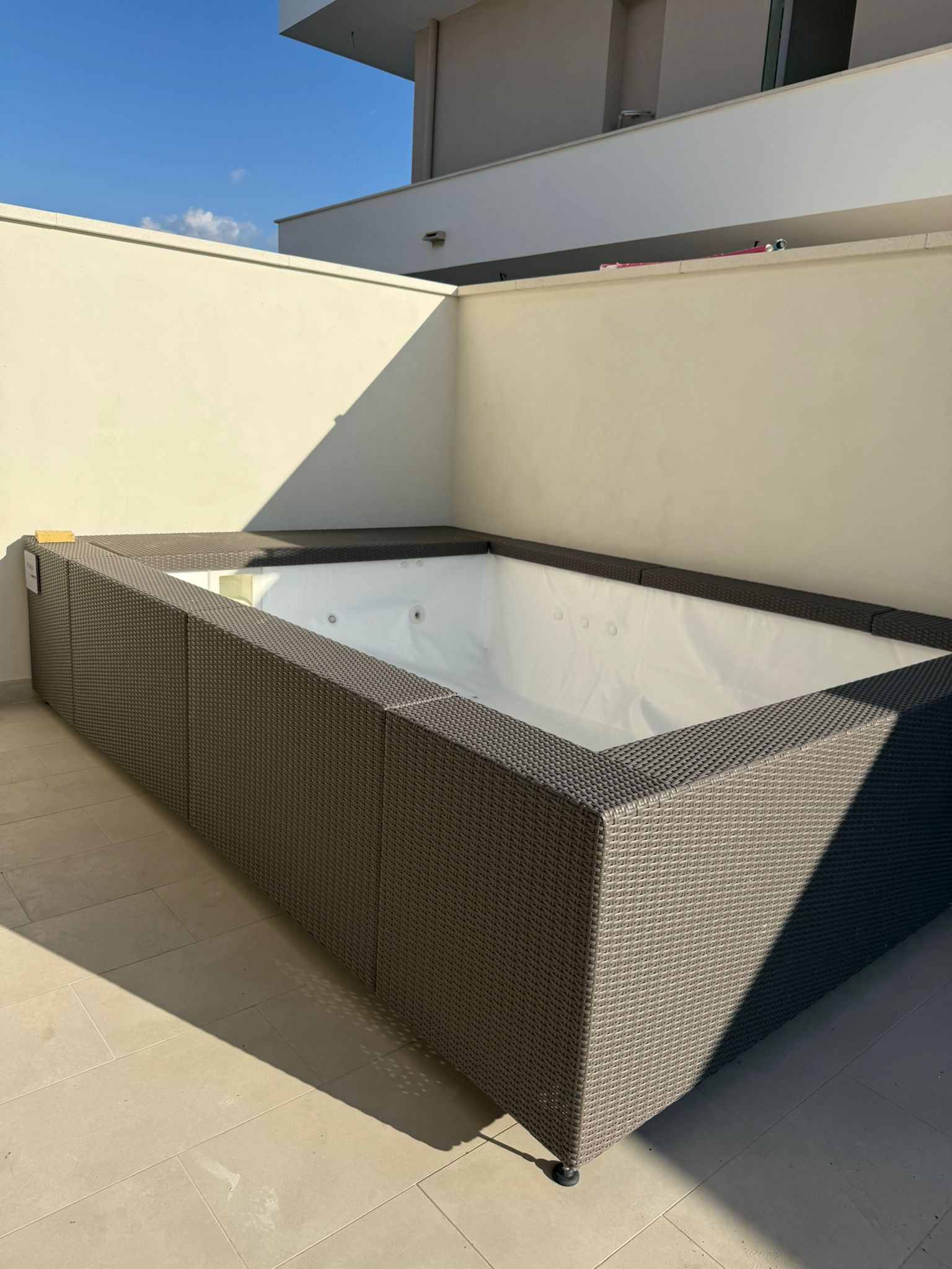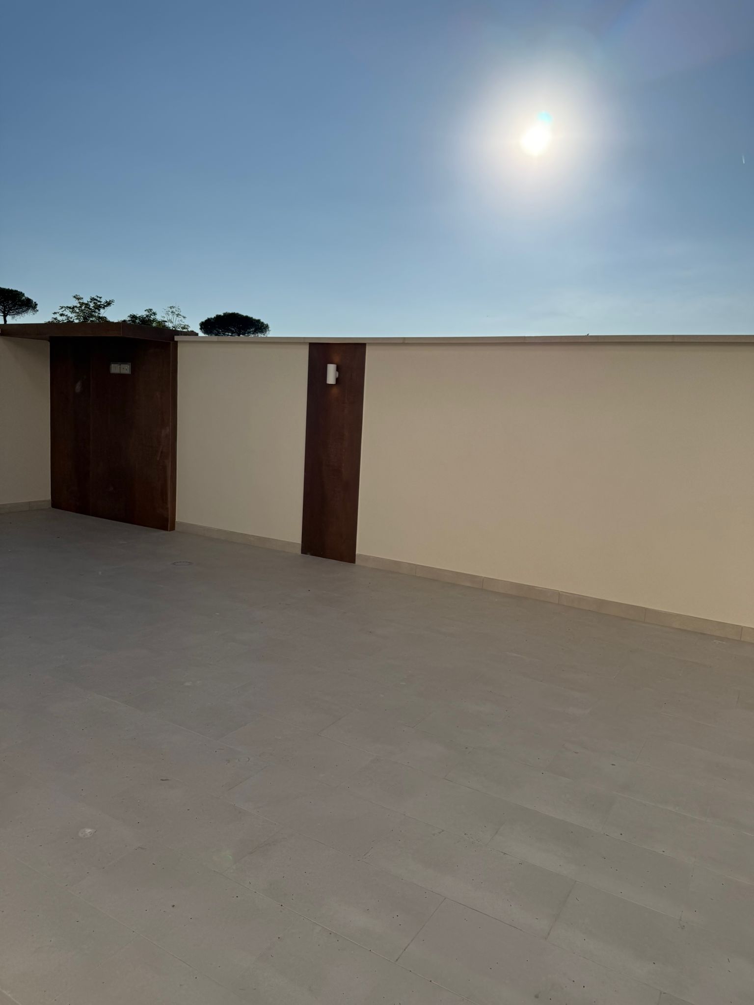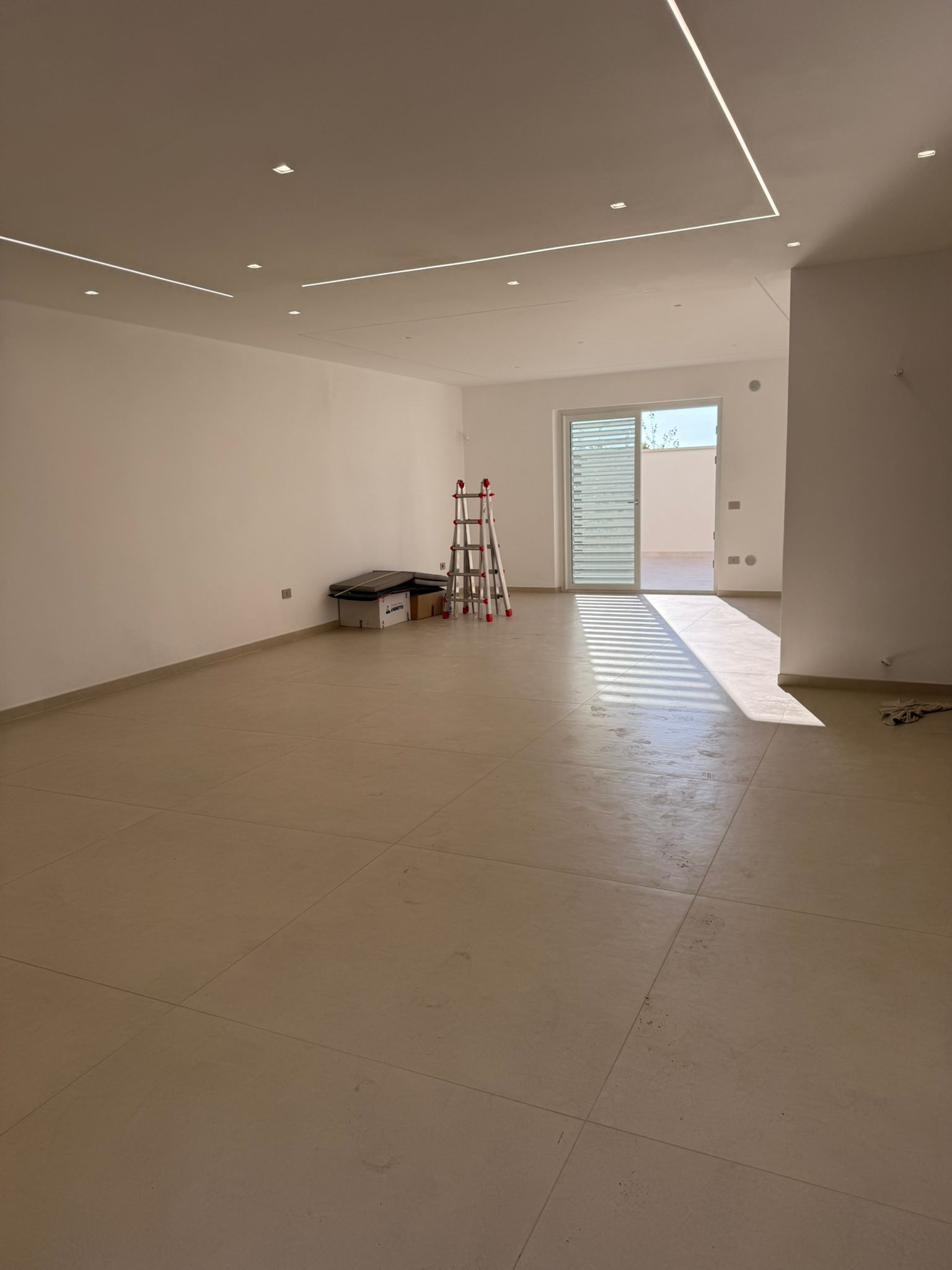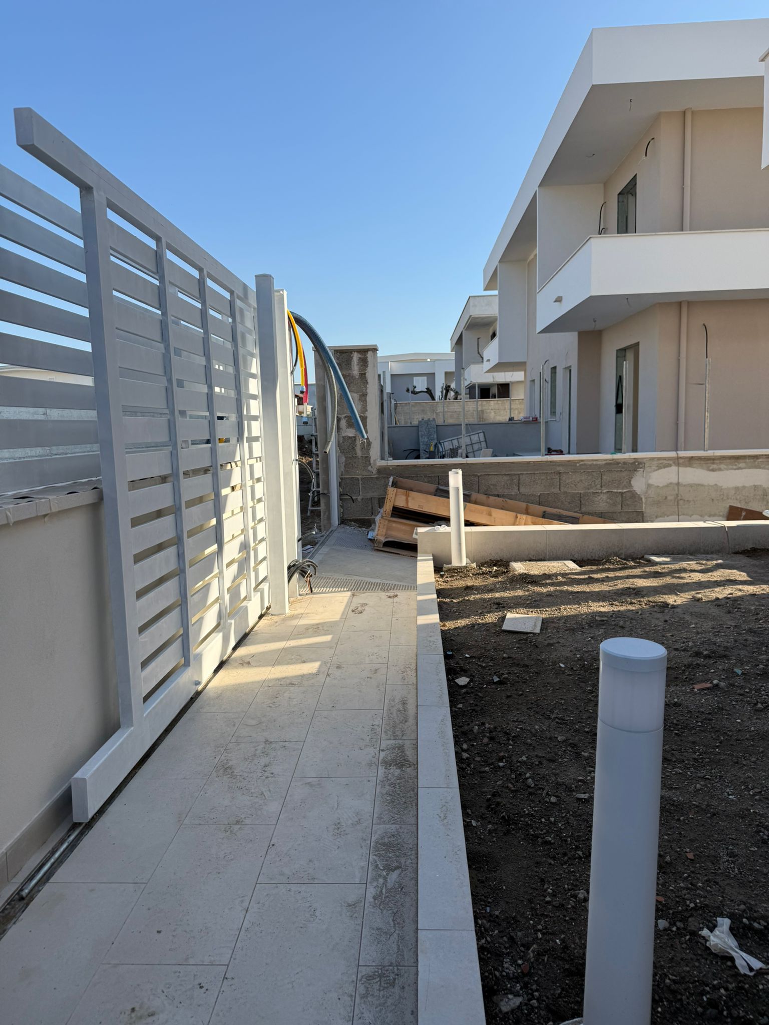 Al piano rialzato, invece, si apre la luminosa zona giorno, con salone e cucina in open space, un bagno e l’uscita sulla corte esterna esclusiva, divisa tra giardino frontale e terrazzo posteriore. Qui è già predisposta un’area per cucina esterna, angolo TV e piscina: perfetta per vivere momenti di relax e convivialità all’aperto.