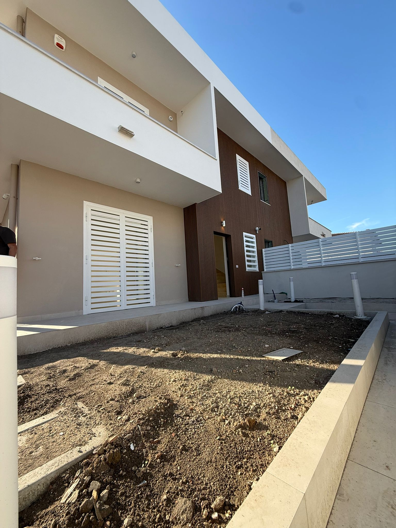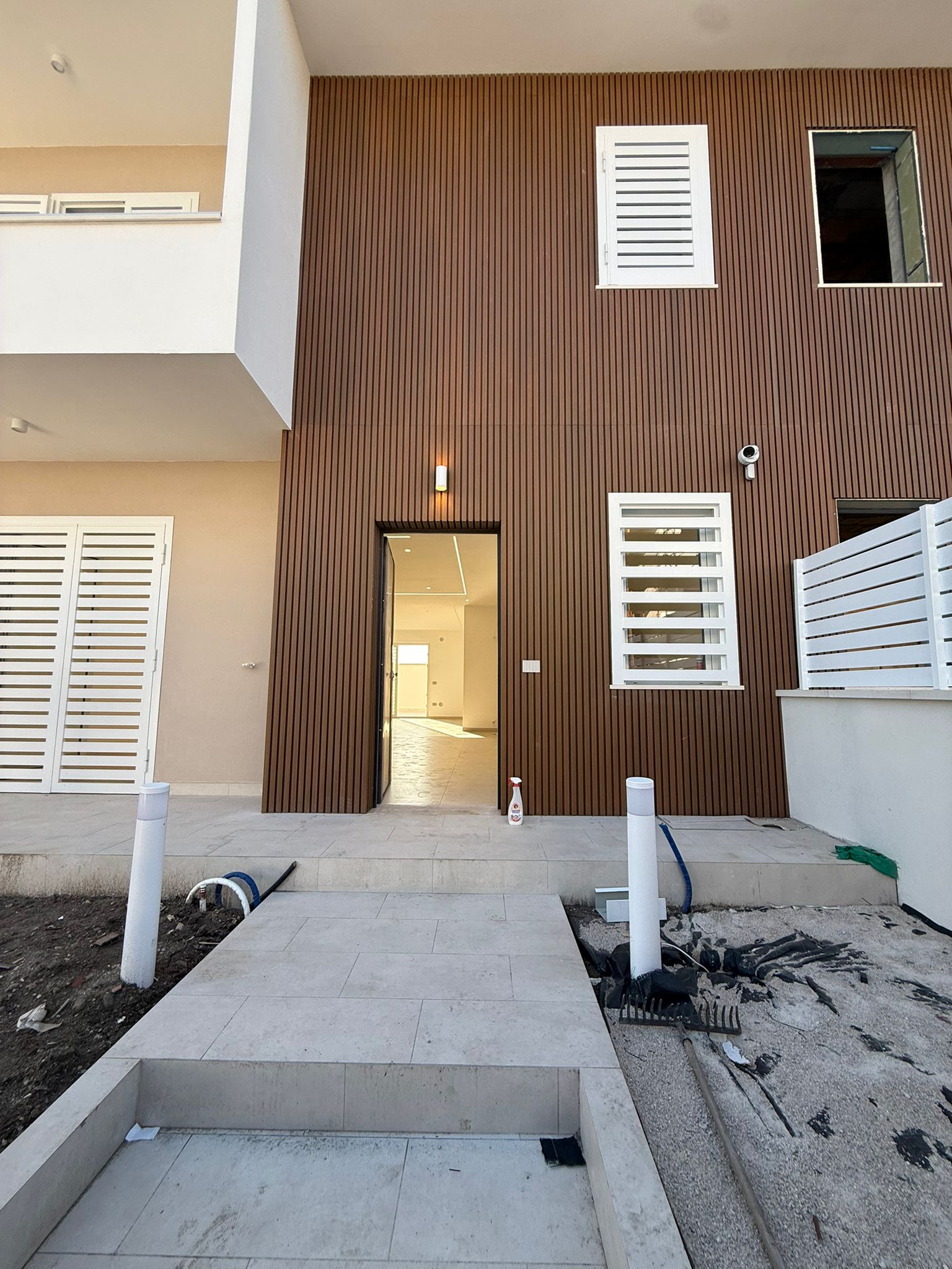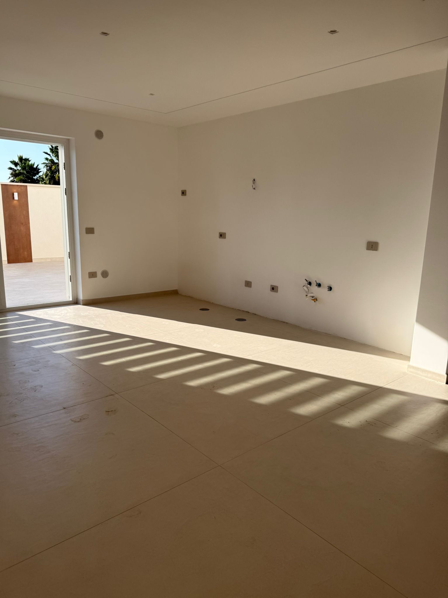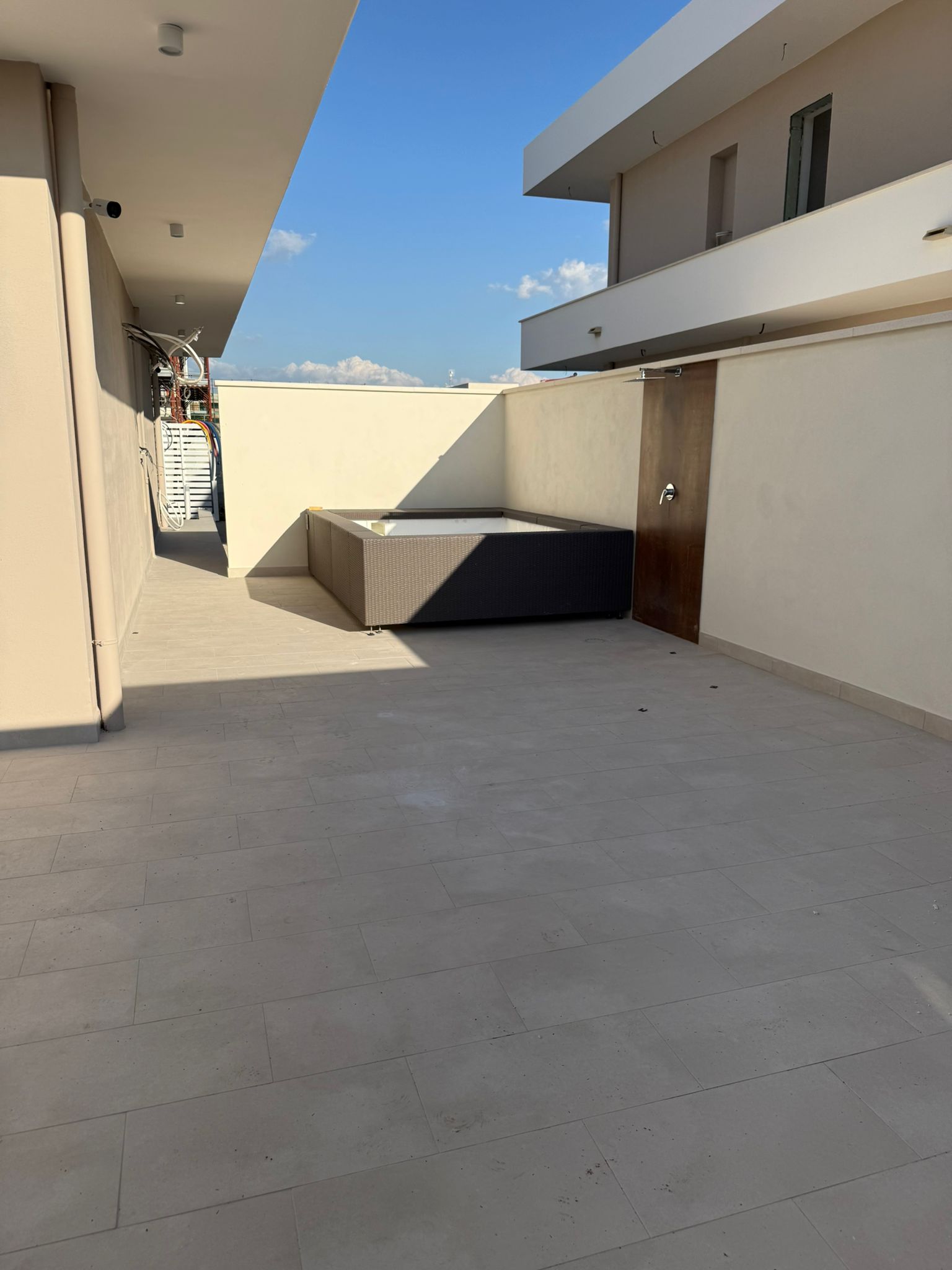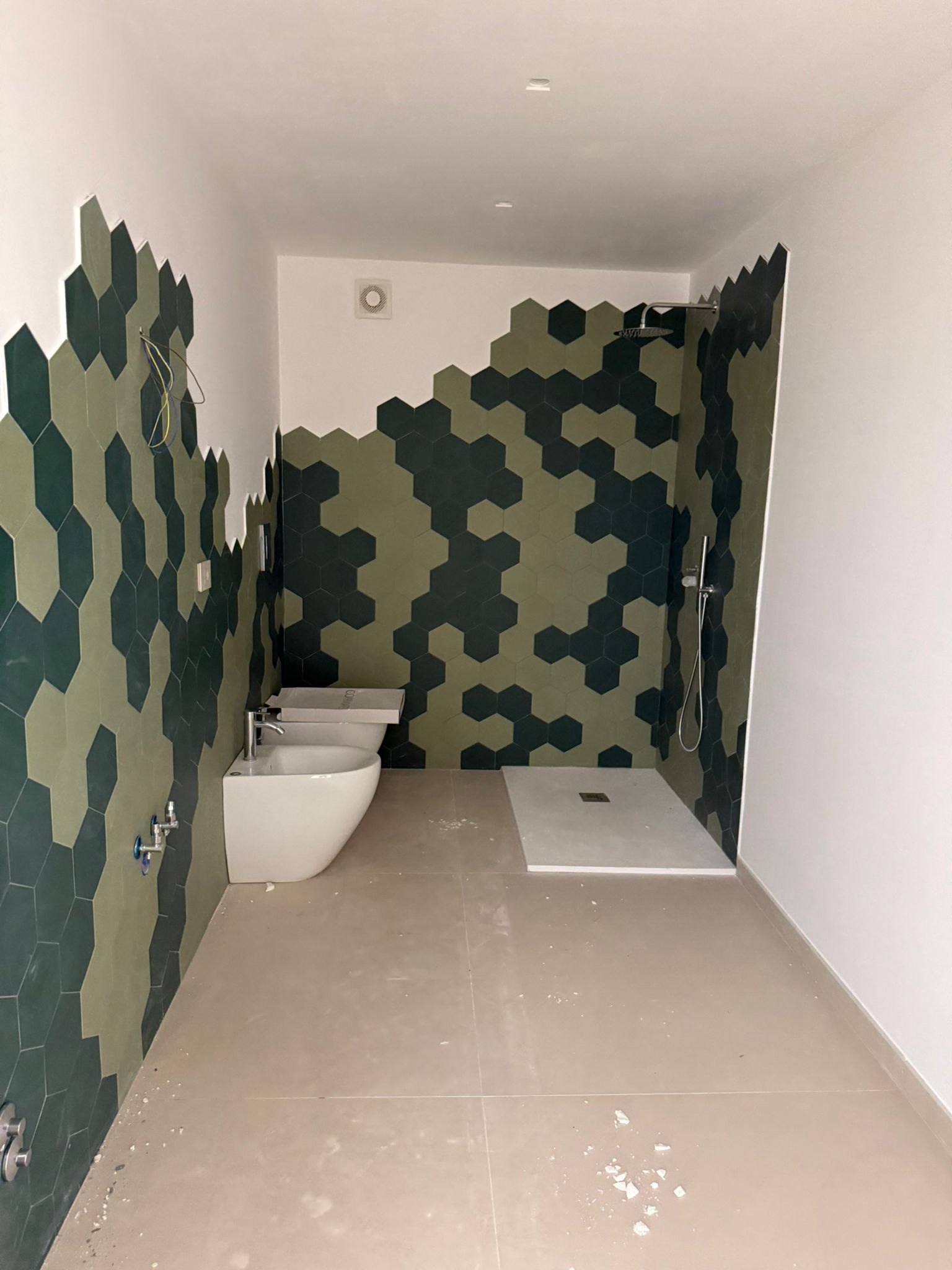 Al piano rialzato, invece, si apre la luminosa zona giorno, con salone e cucina in open space, un bagno e l’uscita sulla corte esterna esclusiva, divisa tra giardino frontale e terrazzo posteriore. Qui è già predisposta un’area per cucina esterna, angolo TV e piscina: perfetta per vivere momenti di relax e convivialità all’aperto.
